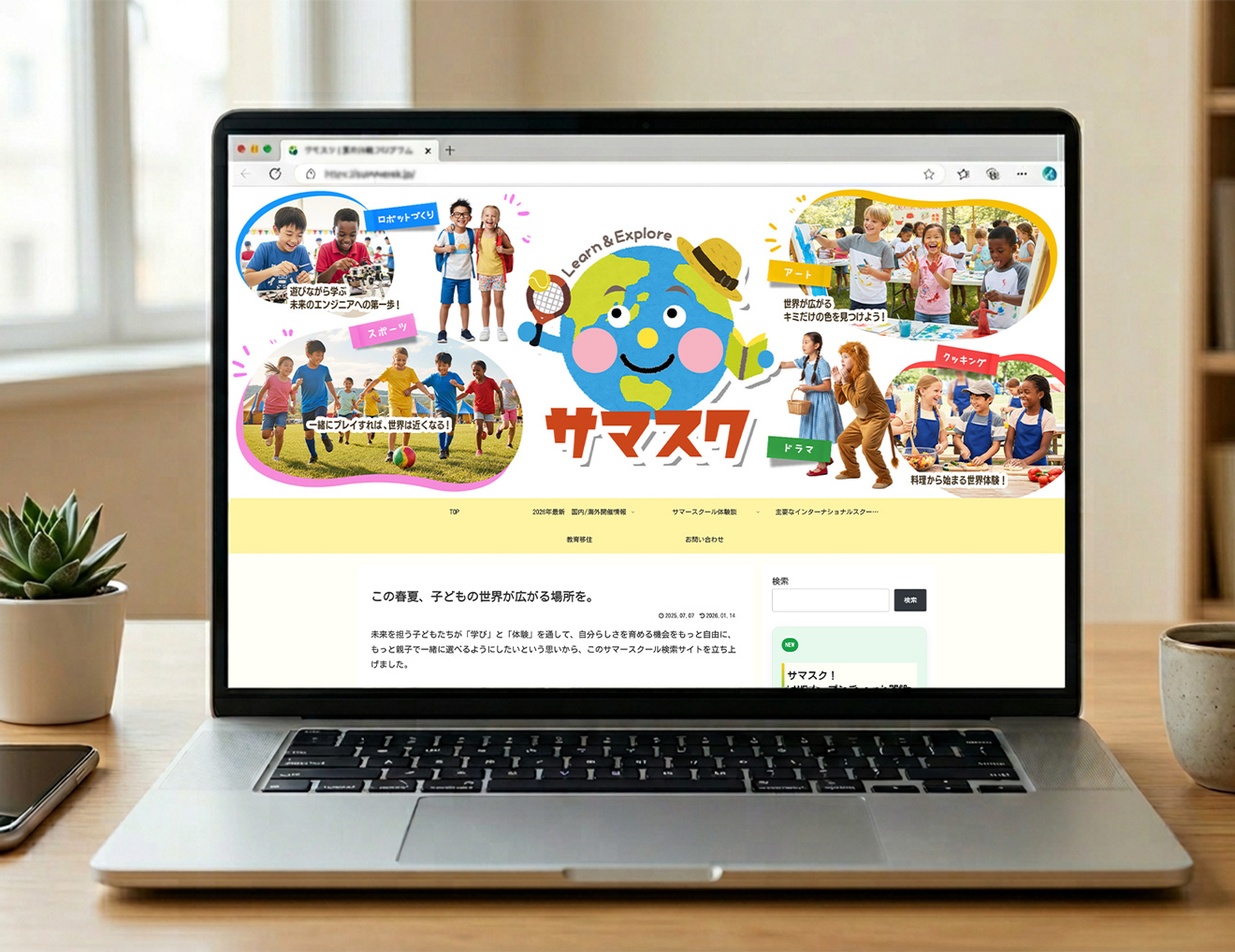 画面センターには、麦わら帽子を被りテニスラケットや本を手にした「地球」のキャラクターロゴ(ロゴデザインも担当)を配置。 私自身、小学1年の母であり、英語オンラインレッスンも受けているため、今後視野に入れていきたいサマースクール情報がまとめられているサイトは有難く、国内外のプログラムを通じて、世界を身近に、のびのびと学んでほしいという私と同じ親御さんの願いをシンボリックに仕立てた。