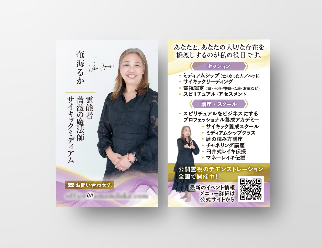 裏面には「セッション」と「講座・スクール」の2軸でメニューを整理。 「最新のイベント情報やメニュー詳細はQRコードから」という明確な動線を設けることで、名刺交換からスムーズに予約・公式サイトへと誘導する設計にしている。公開霊視デモンストレーションを目立たせるために、るかさんの動きのある画像を配置しシズル感を出した。