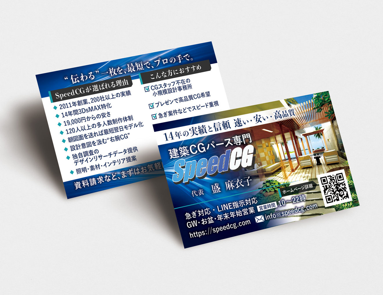 沖縄県を拠点に活動されている『建築CGパース専門 SpeedCG』の代表・盛麻衣子さまの名刺デザイン。名刺アドバイスをされているかさこさんと制作させていただいた。SpeedCGさまは、建築設計事務所やデザイン会社向けに、短納期・高品質な建築CGパースを提供している専門スタジオ。創業以来14年間、CGの専門技術に加え、しっかりと建築教育を受け建築事務所勤務経験もある日本人管理制作によるきめ細やかなコミュニケーションと建築的視点で、設計意図を正確に可視化する『魅力あふれるCGパース』を制作している。