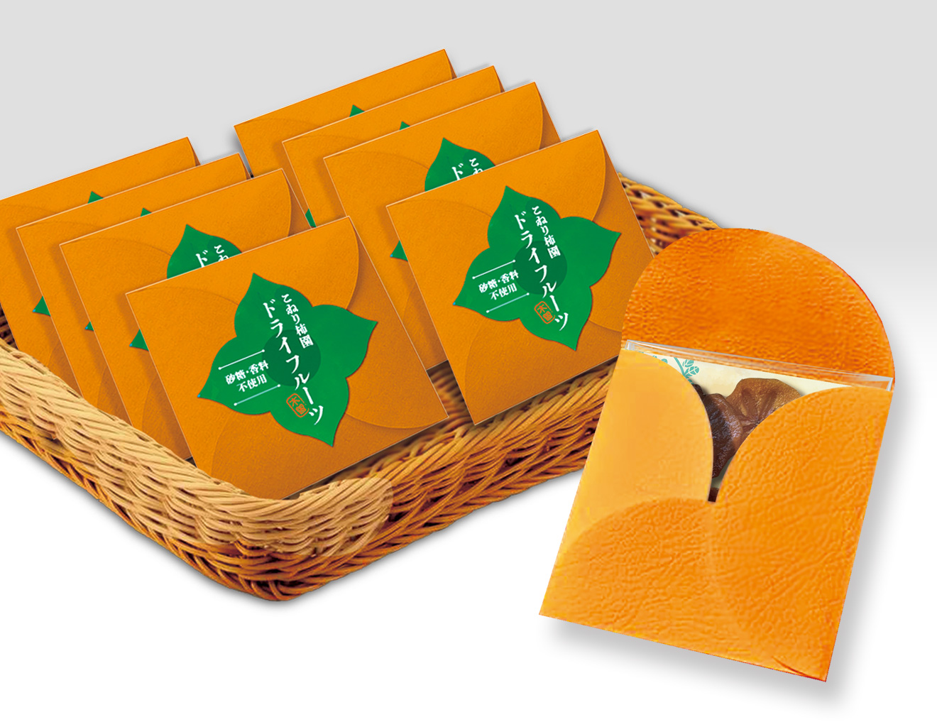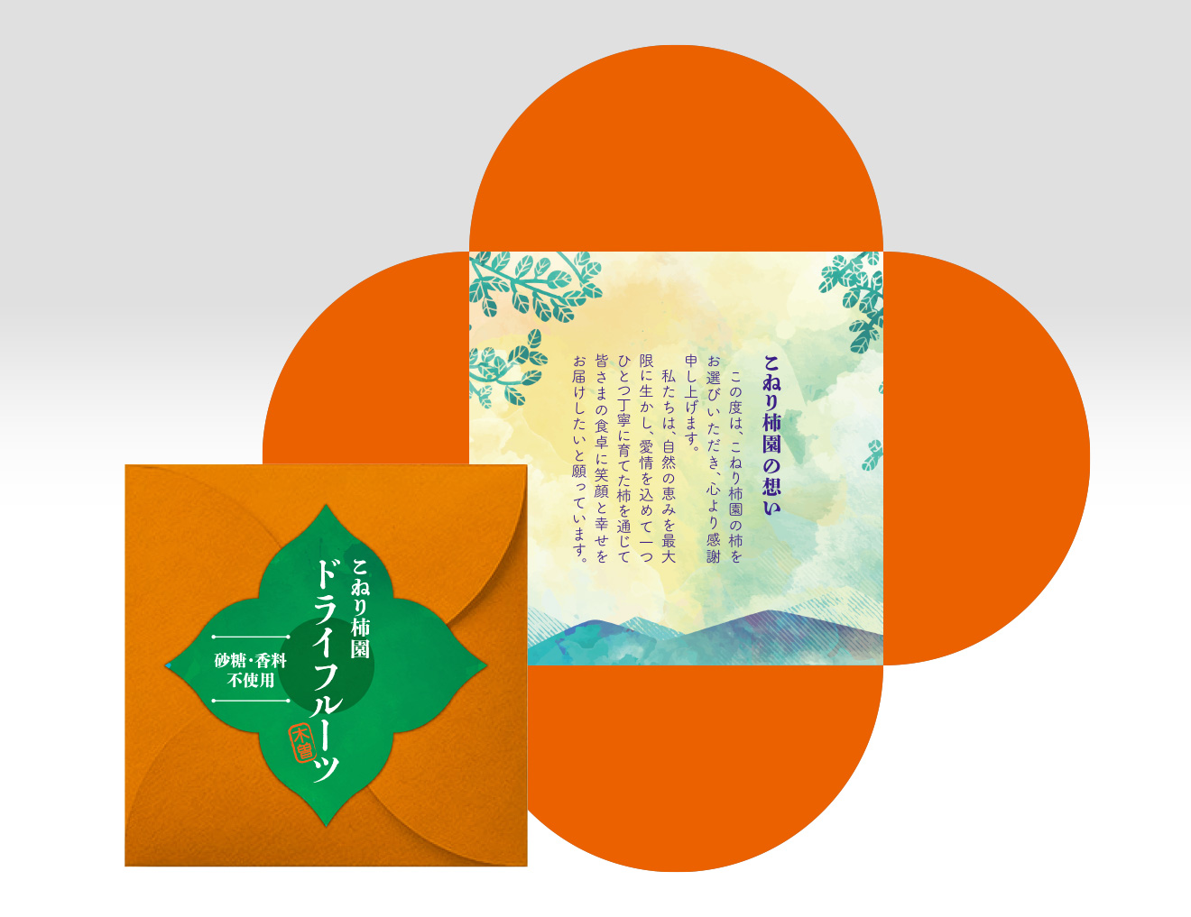 福岡県築上郡にある『柿のデパートこねり柿園』さまの、ドライフルーツ用パッケージデザイン。以前、出荷用のロゴラベルデザインもさせていただいた。今回は、干し柿、柿氷、ドライチップのパッケージを同時進行でさせていただき、打ち合わせから納品まで約8カ月かけたプロジェクトとなった。